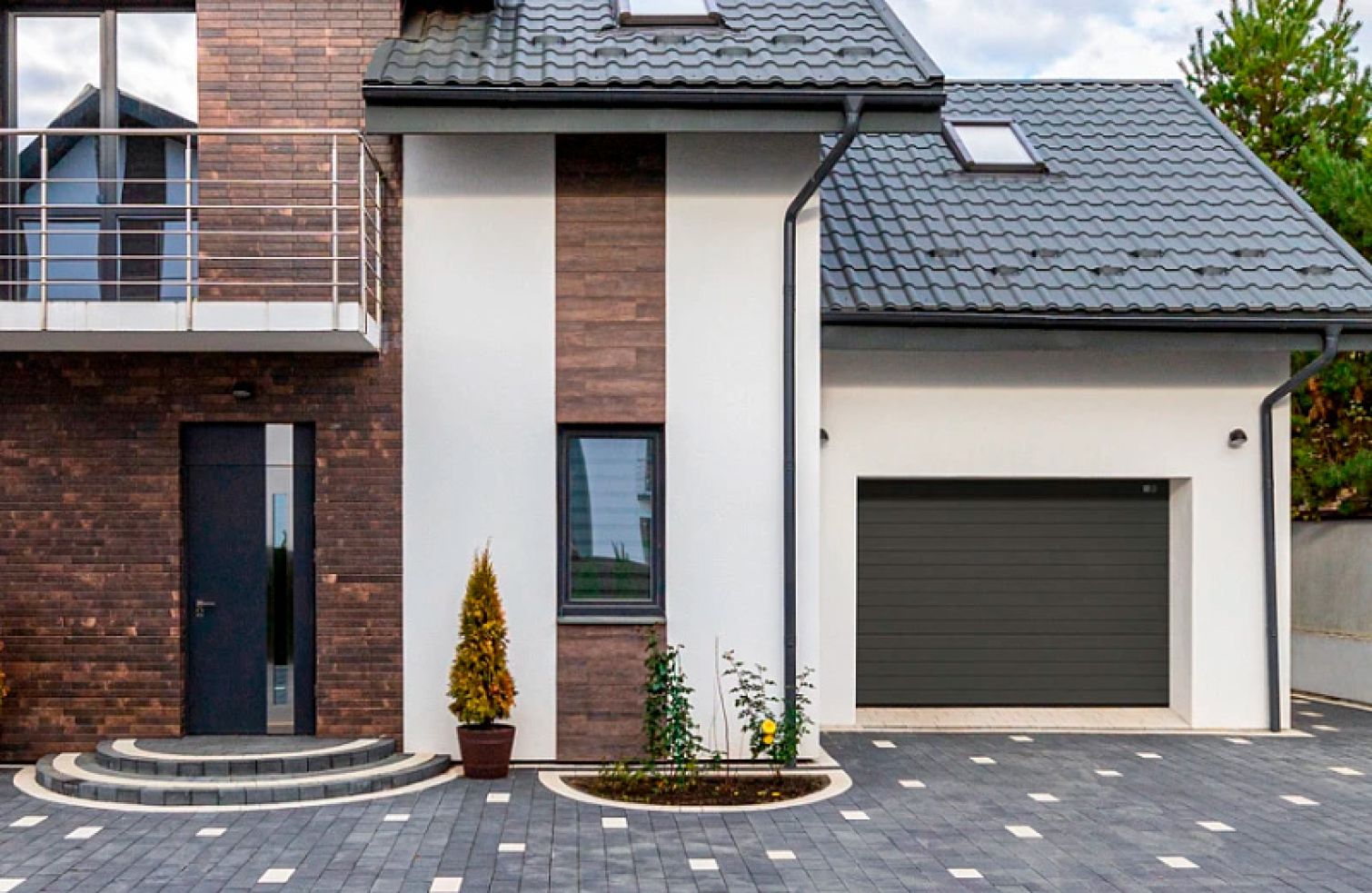 Porțile din panouri sandwich cu textură mată, mătăsoasă la atingere, au un aspect sobru și concis.