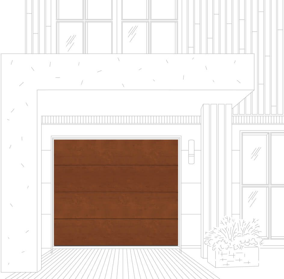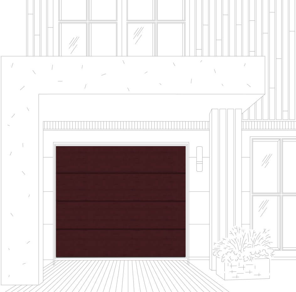 На сэндвич-панели имеется горизонтальная полоса, выполняющая декоративную функцию. Секционные ворота с рисунком M-гофр будто собраны из досок средней ширины.