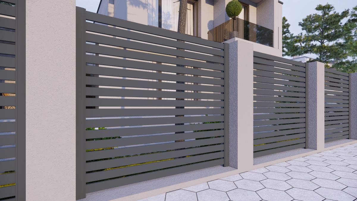 Ограждение из алюминиево профиля 80х20 , укрепленные каркасом из стали 80х80, длина одной секции 2 метра и высотой 1,8 метра.